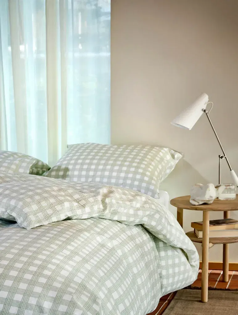 Birk är ett bäddset i en härligt mjuk bäckeböljekvalitet som har en avslappnad och trendig look. Bäckeböljan skapar en kombination av krisp och värme till sängkläderna. Bäddsetet har ett klassiskt rutigt mönster i ljusgrönt och vitt som passar in i alla olika hem. Satsa på ett klassiskt uttryck med ett vitt lakan eller kombinera med ett lakan i en matchande färg för att öka spänningen i sovrummet!