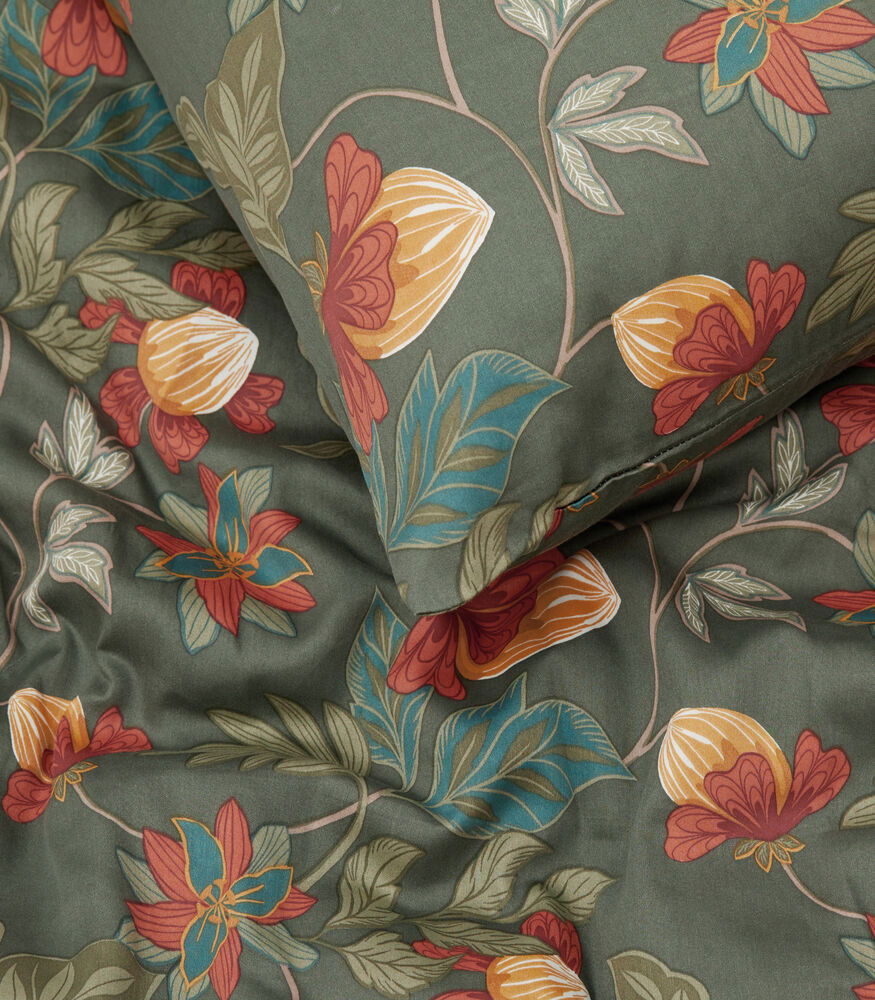 Bratteby tar en igenom hösten och vintern på ett mysigt och behagligt sätt. Bäddsetet har ett naturinspirerat mönster av blommor och löv med härliga toner på en underbart grön bottenfärg. Bratteby är tillverkat i fin satinkvalitet som gör att man aldrig vill lämna sängen på en ruskig höstmorgon, vilket är ännu mer perfekt till helgmyset!