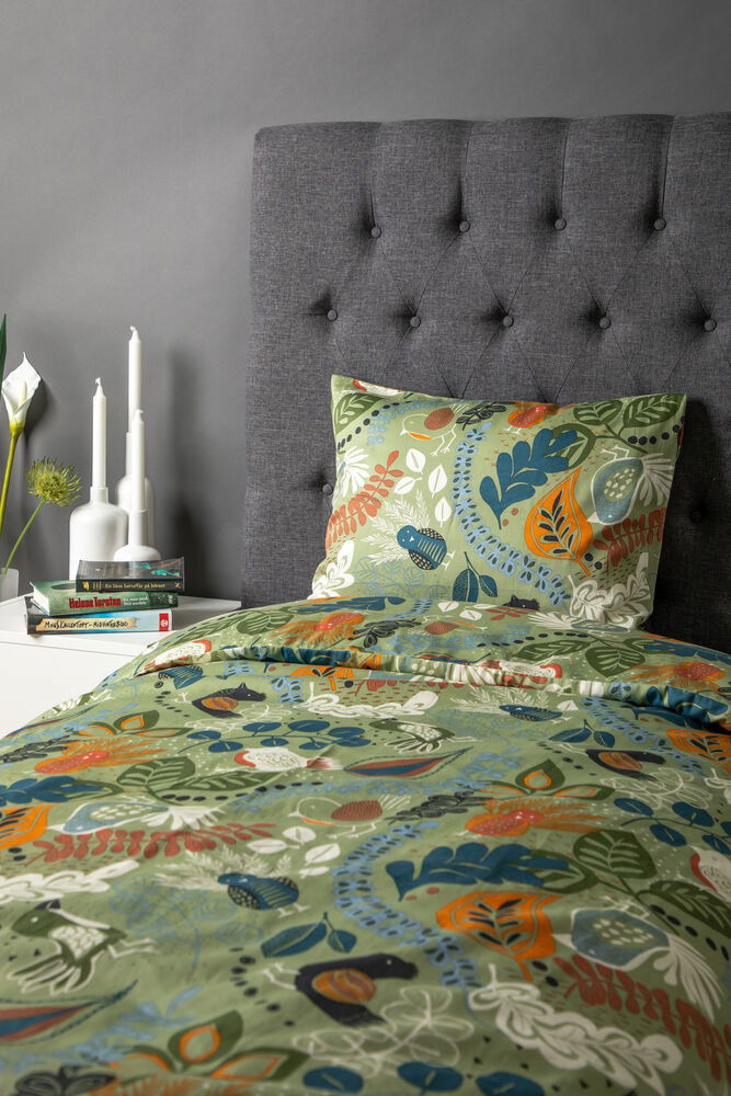 Bädda sängen med Stormhagen Grön som ger en ljuvlig färgklick till sovrummet på ett stilrent och smakfullt sätt. Det är inte enbart ett fint örngott, utan det är en fantastisk inredningsdetalj som fångar ögonens uppmärksamhet direkt. Skruva upp känslan av lyx med det vackra och lekfulla mönstret av fåglar och blad i olika färger, som förstärks på en kompletterande bottenfärg i en härligt grön nyans. Örngottet matchas gärna med Stormhagen-bäddseten för både enkelsäng och dubbelsäng!